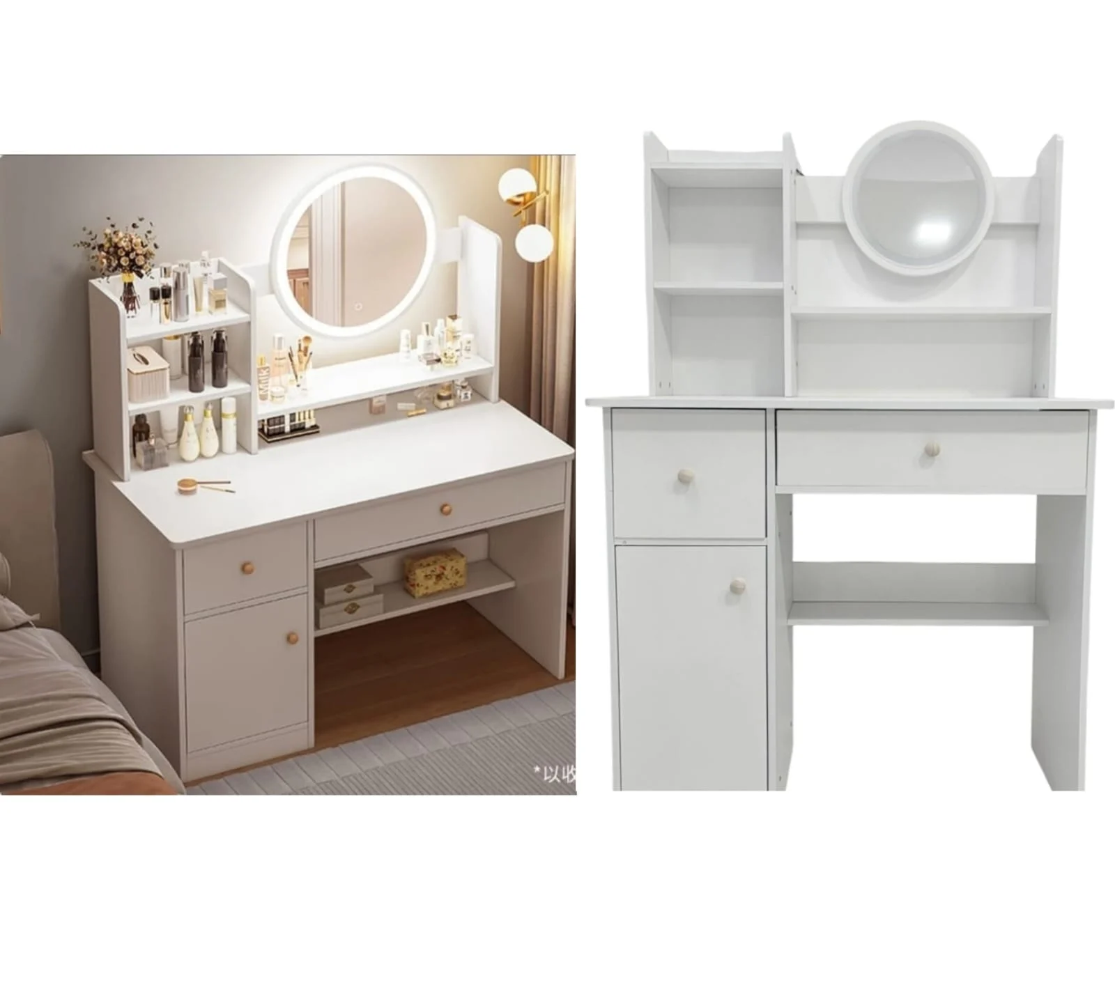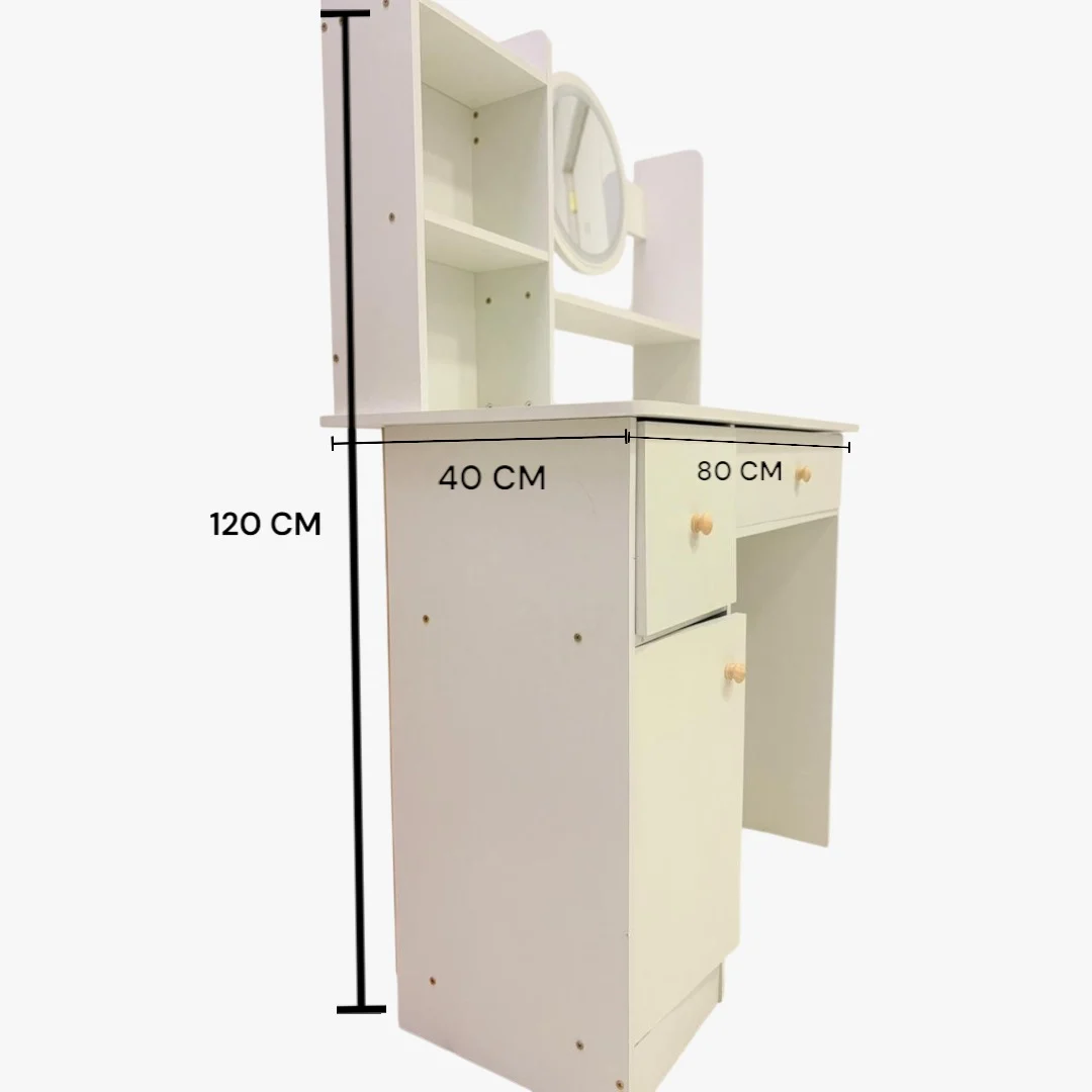 El tamaño del producto es de 80*40*120cm, la mesa tocador está fabricada con superficie de laca dura de alto brillo, suave y fácil de limpiar, que mantiene la mesa como nueva incluso después de mucho tiempo de uso. Perfecto para los amantes del maquillaje. Todos los cosméticos que pongas en la tabla son fáciles de limpiar. Puede guardar todos sus perfumes, maquillaje, rizadores, productos para el cuidado de la piel y todos sus artículos esenciales en esta cómoda para que su dormitorio tenga un aspecto muy limpio y elegante.